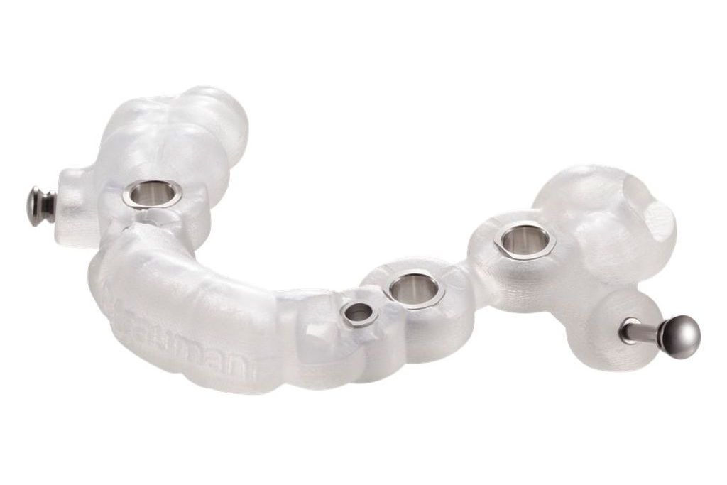 手術の際に使用する、人工歯根を埋め込む適切な位置・角度・深さが記録された「サージカルガイド」を製作し、実際にお口の中に装着して適合に問題がないかを確認します。